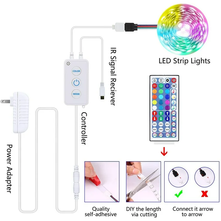 Controlling the LED strip lights via APP, remote control and controller. With the APP, you can freely choose to control 16 million colors. Upgraded remote With the 44-keys IR remote, change music modes, color modes. The buttons of the control box are designed to change color, switch on/off and speed the light also set the mode demo.