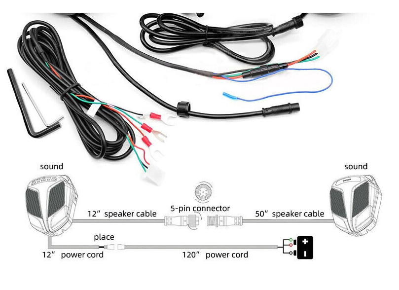 Overall 5" Width Matte Black Speaker Housing with Glossy Black "T" Style Mesh Screen. Waterproof Design. Built with High-Quality ABS Material. 50" Long Speaker Cable(Slave speaker). 120" Long Power Cord for Easy Custom Installation.