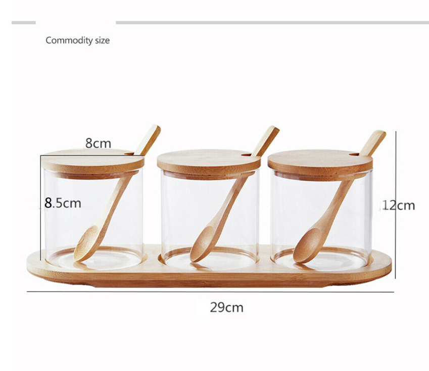 Spice bottles set includes 3 pieces glass Spice Jars, 3 Lids, and 3 spoon and 1 tray, simple and refillable.