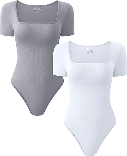 OQQ Women's 2 Piece Bodysuits Sexy Ribbed One Piece Square Neck Short Sleeve Bod